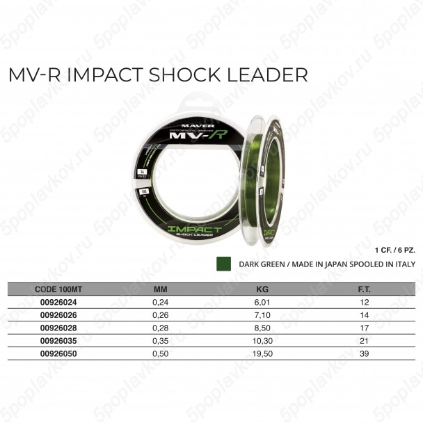 При ловле на дальние дистанции с помощью фидера обычно используют тонкий плетеный шнур или нейлоновую леску, что требует применения шок-лидера высочайшего качества. Поэтому Maver решили разработать Mv-r Impact, идеально подходящий для использования в качестве шок-лидера благодаря своей износостойкости и устойчивости к любым видам узлов. В пресноводной ловле его можно использовать при фидерной ловле, методной фидерной ловле и карповой ловле, а в соленой воде он идеально подходит для ловли с берега.