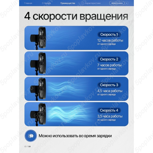 - 4 скорости на выбор: Легкий бриз или мощный ураган? Регулируйте скорость одним нажатием. Мощный воздушный поток эффективно охлаждает даже в безветренную погоду.